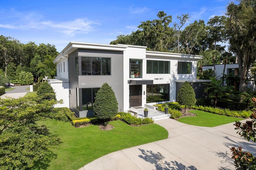 Private setting within the exclusive Lake Maitland Owl Preserve, this spectacular five-bedroom contemporary residence was masterfully built in 2019 by award-winning E2 Homes. A dramatic 12-foot-tall wooden pivot-door makes a striking first impression, opening into a light-filled foyer, gathering, dining, and kitchen wide-open everyday living area with soaring two-story ceilings. A floating staircase becomes an architectural centerpiece, while a sleek linear gas fireplace framed in modern stone design, anchors the living room. Flowing seamlessly into the dining area and chef’s kitchen, the home is designed for both comfort and elevated entertaining. The kitchen is a contemporary showcase, boasting top-of-the-line Wolf and Sub-Zero appliances, a hidden walk-in pantry, and an extraordinary backlit marble feature wall that serves as art and function. Disappearing glass sliders, operated remotely, blur the lines between indoors and out, extending the living space to a covered lanai with multiple sitting and dining areas, a full summer kitchen, and automated screens that protect from sun, rain and the elements. Beyond, a contemporary saltwater pool and spa with water features is framed by a sweeping lawn and thoughtfully designed herb garden with raised beds. The first-floor primary suite offers a serene retreat with a custom walk-in closet and spa-inspired bath featuring a striking tub/shower combination wet room. Also on the main level is a fifth bedroom used as a home office, complete with an en-suite bath. Upstairs living areas include a flexible loft/lounge area at the top of the stairs and leading to two flanked secondary bedrooms, and a fourth junior suite with spacious bath/walk-in closet, then anchored with access to a spacious outdoor balcony overlooking the pool and grounds. Additional highlights include beautiful porcelain tile and elegant dark wood flooring throughout, a three-car side-entry garage, and a circular drive. Secluded, but ideally located, the home offers a tranquil, preserve setting while remaining just minutes from Park Avenue’s fine shops and dining, Maitland’s cultural corridor and with convenient access to top-rated schools, downtown Orlando, and the International and Executive airports.