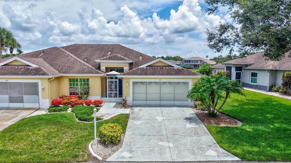 Welcome to effortless living! This beautifully maintained 2-bedroom, 2-bath home offers a split-bedroom floor plan designed for comfort and privacy, with views of the pond from both bedrooms. Enjoy the ease of brand new luxury vinyl flooring throughout, adding a modern touch to every room. A separate den/formal dining/office area makes every square foot count! Corian counters, gutters, and extra insulation in attic are all bonuses! Take in serene pond views from your bright and airy sunroom, the perfect spot for morning coffee or evening relaxation. The 2-car garage provides ample storage and convenience, and as part of a golf cart-friendly community, getting around couldn’t be easier. This home also features maintenance-free exterior living, giving you more time to enjoy the countless amenities Kings Point offers—including golf, pools, clubs, fitness centers, and more. Whether you're seeking relaxation or an active lifestyle, this home truly has it all. Don’t miss your chance to live the Florida lifestyle in comfort and style!